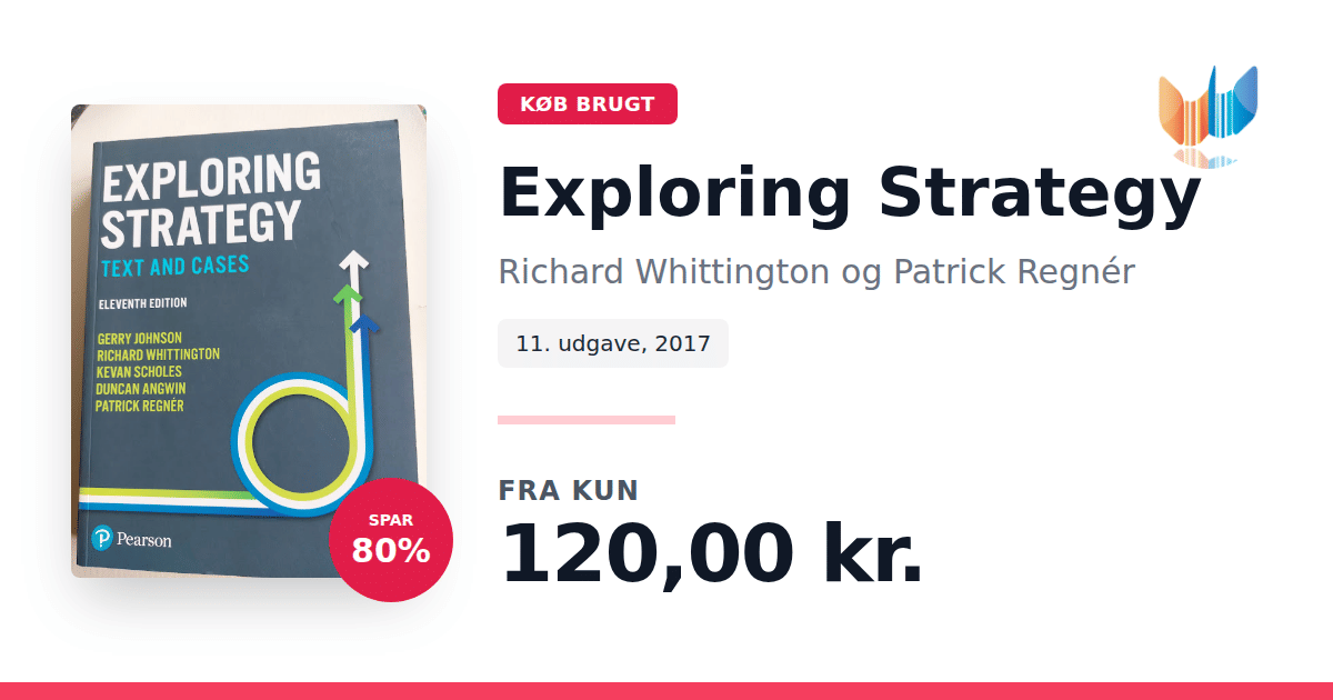 Lige nu kan du købe "Exploring Strategy" af Richard Whittington og Patrick Regnér til kun 120,00 kr. Du sparer hele 80% af nyprisen! Bogen du ser her er brugt, og i perfekt stand. Vi har i øjeblikket 5 eksemplarer til salg af "Exploring Strategy", så husk at se de forskellige udgaver.
