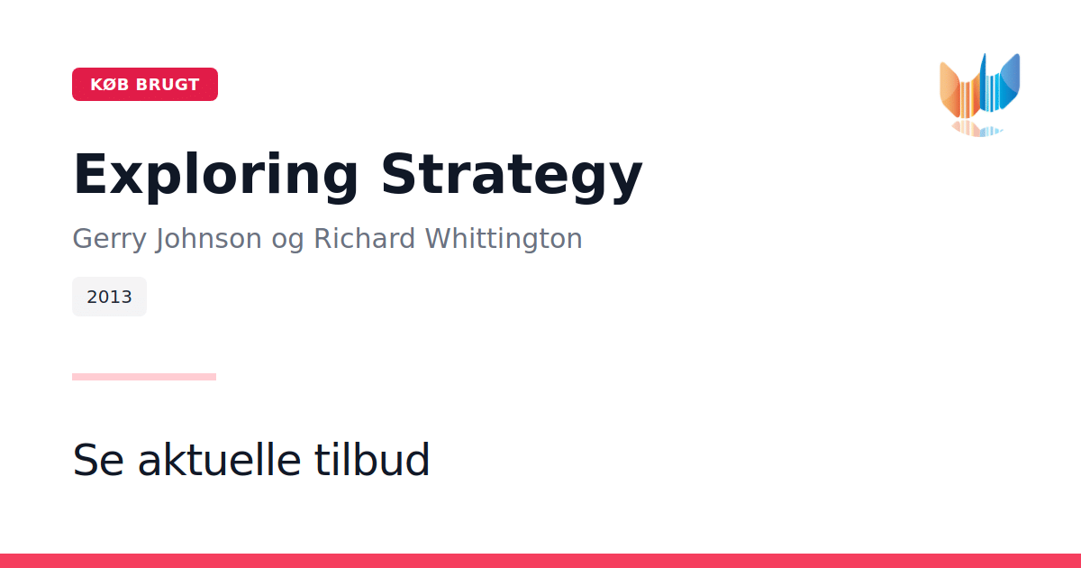 Exploring Strategy giver et samlet og praktisk indblik i strategisk ledelse og de værktøjer, der former organisationers vækst, innovation og forandringsprocesser. Fra iværksættervirksomheder til multinationale koncerner - samt offentlige institutioner og nonprofitorganisationer - udforskes, hvordan strategiske beslutninger skaber bæredygtig udvikling. Skrevet af en internationalt anerkendt forfattergruppe - Gerry Johnson, Richard Whittington, Duncan Angwin, Kevan Scholes og Patrick Regnér - præsenterer denne paperbackudgave (2013) en opdateret gennemgang af centrale emner som internationalisering, corporate governance, innovation og iværksætteri. Klar tekst og illustrative eksempler sikrer, at både teori og praksis kobles tæt sammen. Med sine 592 sider tilbyder bogen en dybdegående, men stadig tilgængelig introduktion til strategisk tænkning. Gennem en struktureret opbygning guides læseren fra de grundlæggende strategimodeller til avancerede analyser, hvilket gør Exploring Strategy uundværlig for studerende, konsulenter og ledere, der ønsker at udvikle og implementere effektive strategier. Udgivet af Pearson Education, 2013.