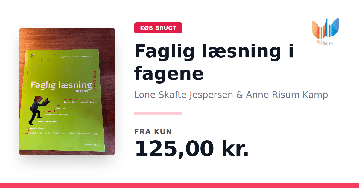 Lige nu kan du købe "Faglig læsning i fagene" af Lone Skafte Jespersen & Anne Risum Kamp til kun 125,00 kr. Bogen du ser her er brugt, og i perfekt stand. Vi har i øjeblikket 3 eksemplarer til salg af "Faglig læsning i fagene", så husk at se de forskellige udgaver.