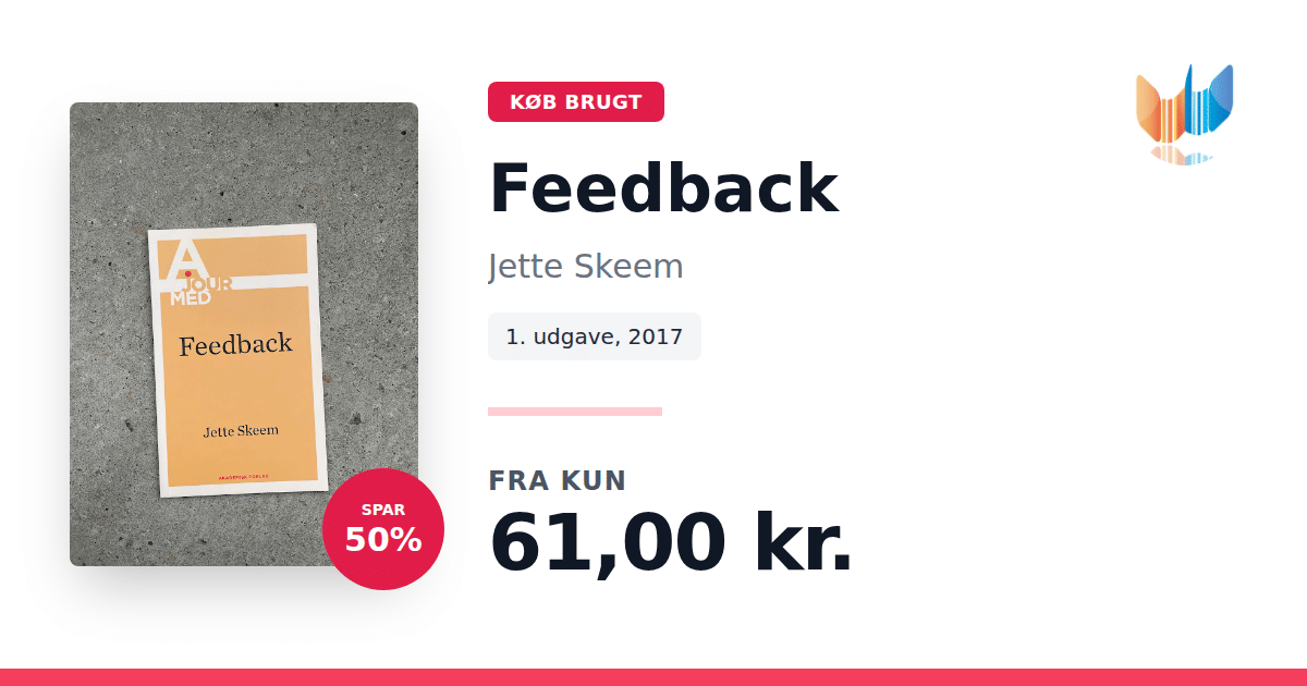 Lige nu kan du købe "Feedback" af Jette Skeem til kun 61,00 kr. Du sparer hele 50% af nyprisen! Bogen du ser her er brugt, og i perfekt stand. Vi har i øjeblikket kun et enkelt eksemplar til salg af "Feedback", så slå til mens du kan!