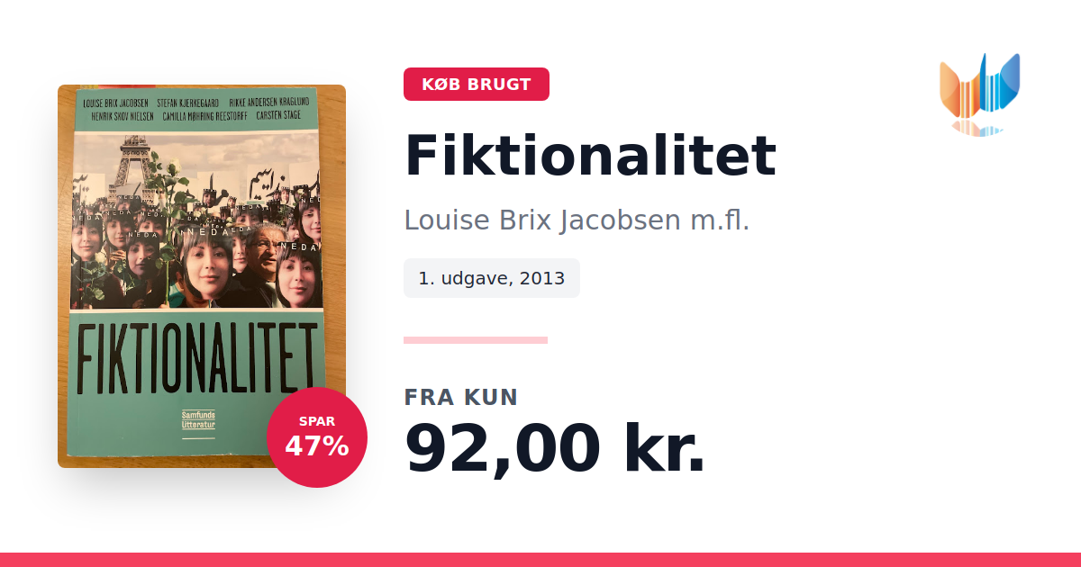 Lige nu kan du købe "Fiktionalitet" af Louise Brix Jacobsen m.fl. til kun 92,00 kr. Du sparer hele 47% af nyprisen! Bogen du ser her er brugt, og i perfekt stand. Vi har i øjeblikket kun et enkelt eksemplar til salg af "Fiktionalitet", så slå til mens du kan!