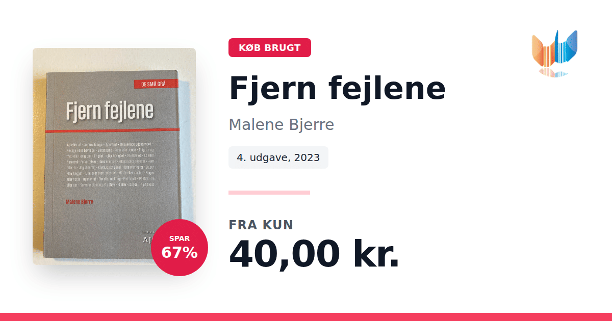 Lige nu kan du købe "Fjern fejlene" af Malene Bjerre til kun 40,00 kr. Du sparer hele 67% af nyprisen! Bogen du ser her er brugt, og i perfekt stand. Vi har i øjeblikket kun et enkelt eksemplar til salg af "Fjern fejlene", så slå til mens du kan!