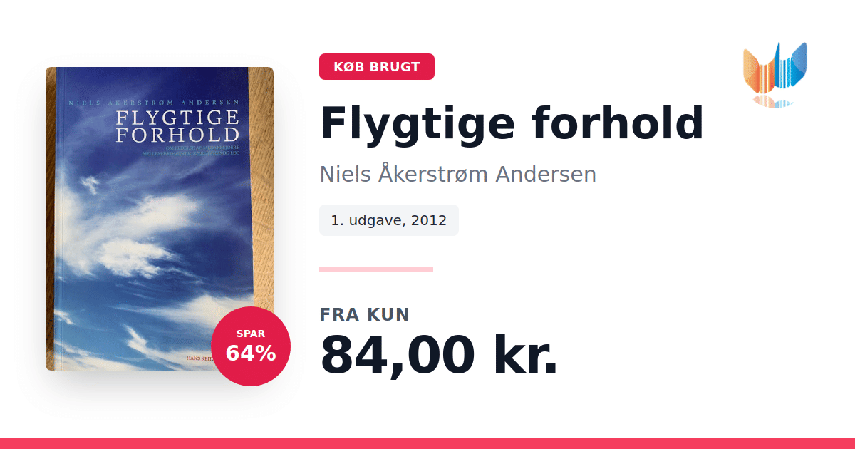 Lige nu kan du købe "Flygtige forhold" af Niels Åkerstrøm Andersen til kun 84,00 kr. Du sparer hele 64% af nyprisen! Bogen du ser her er brugt, og i perfekt stand. Vi har i øjeblikket kun et enkelt eksemplar til salg af "Flygtige forhold", så slå til mens du kan!