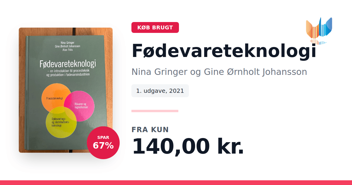 Lige nu kan du købe "Fødevareteknologi" af Nina Gringer og Gine Ørnholt Johansson til kun 140,00 kr. Du sparer hele 67% af nyprisen! Bogen du ser her er brugt, og i perfekt stand. Vi har i øjeblikket kun et enkelt eksemplar til salg af "Fødevareteknologi", så slå til mens du kan!