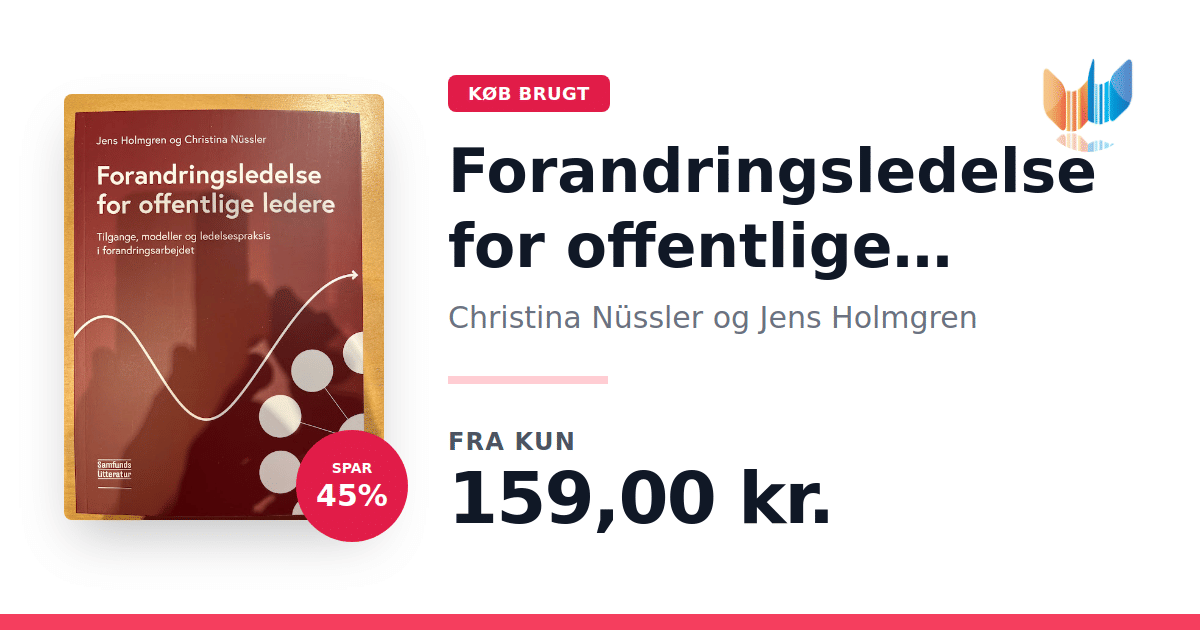 Lige nu kan du købe "Forandringsledelse for offentlige ledere" af Christina Nüssler og Jens Holmgren til kun 159,00 kr. Du sparer hele 45% af nyprisen! Bogen du ser her er brugt, og i perfekt stand. Vi har i øjeblikket kun et enkelt eksemplar til salg af "Forandringsledelse for offentlige ledere", så slå til mens du kan!