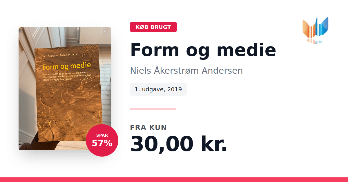 Lige nu kan du købe "Form og medie" af Niels Åkerstrøm Andersen til kun 30,00 kr. Du sparer hele 57% af nyprisen! Bogen du ser her er brugt, og i perfekt stand. Vi har i øjeblikket kun et enkelt eksemplar til salg af "Form og medie", så slå til mens du kan!