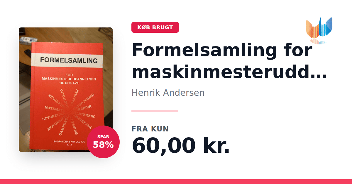 Lige nu kan du købe "Formelsamling for maskinmesteruddannelsen" af Henrik Andersen til kun 60,00 kr. Du sparer hele 58% af nyprisen! Bogen du ser her er brugt, og i perfekt stand. Vi har i øjeblikket kun et enkelt eksemplar til salg af "Formelsamling for maskinmesteruddannelsen", så slå til mens du kan!