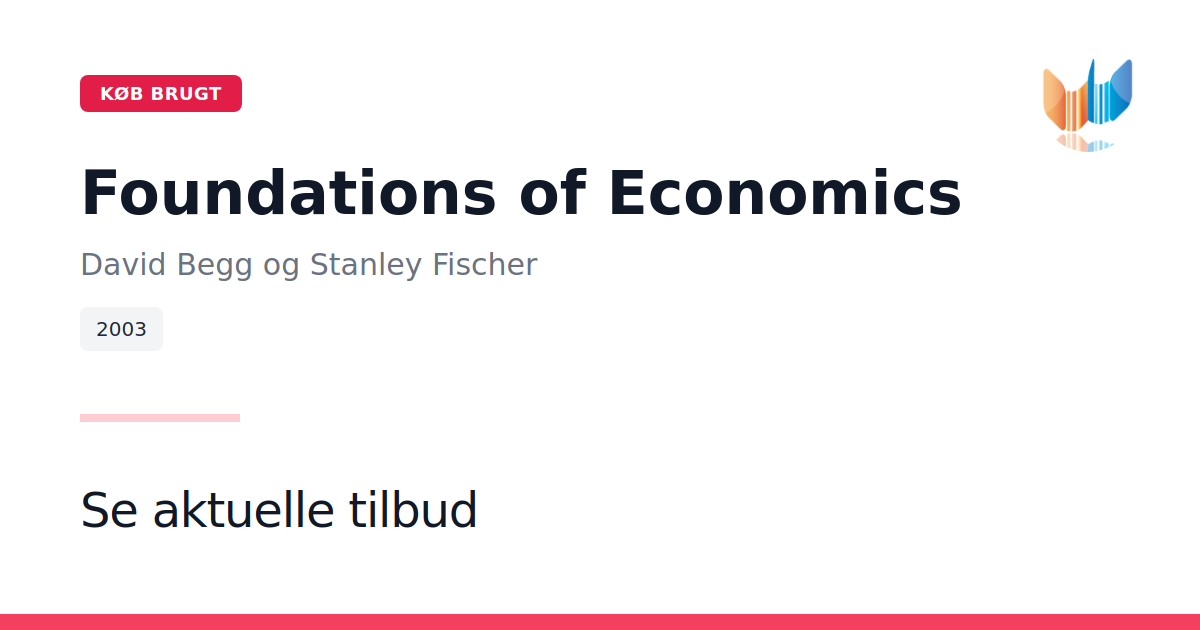 Af David Begg, Stanley Fischer og Rüdiger Dornbusch udgør Foundations of Economics, Second Edition en kortfattet grundbog for ikke-specialiserede studerende på ét-semesters økonomimoduler. Bogen præsenterer centrale økonomiske begreber og modeller på en overskuelig og lettilgængelig måde. Denne udgave viderefører den gennemprøvede sammenhæng, kvalitet og klarhed fra hovedværket Economics, Seventh Edition, rost af BBC Radio Four som studenterbibel. Med sit strukturerede indhold og pædagogiske fokus er Foundations of Economics den ideelle introduktion til økonomiens grundlæggende principper.