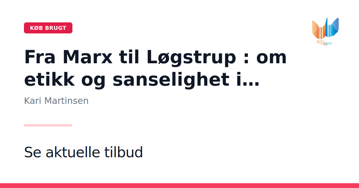 Fra Marx til Løgstrup - om etikk og sanselighed i sykepleien er en indsigtsfuld undersøgelse af de etiske og sanselige aspekter ved sygepleje, som Kari Martinsen formidler med sit karakteristiske teoretiske og reflekterede perspektiv. Denne papirbogsudgave fra 2003 indleder med et helt nyt interview med Kari Martinsen, hvor hun uddyber sit arbejde og den teoretiske baggrund for bogen. Udover dette interview er teksten uændret i forhold til førsteudgaven fra 1993, og bogen står fortsat som et centralt værk til forståelse af etik og sanselighed i sygeplejefaget.