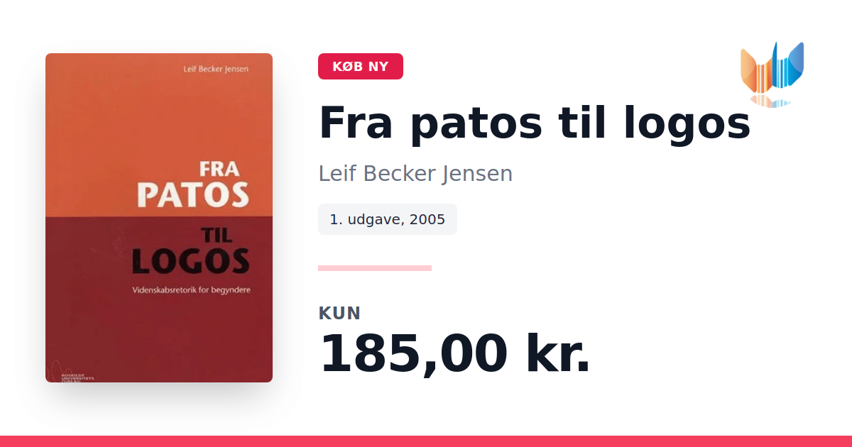 "Fra patos til logos" er en introduktion til videnskabelig retorik, der belyser de grundlæggende normer for, hvordan man skriver inden for den akademiske verden. Bogen stiller skarpt på centrale spørgsmål som, hvorfor en problemformulering bør komme først, hvad rollen er for teorier og metoder, og hvordan man konstruerer en overbevisende videnskabelig argumentation – ikke blot gennem en fast opskrift, men ved at undersøge, hvorfor normerne overhovedet er, som de er. Leif Becker Jensens tilgang understreger, at al videnskabelig kommunikation er retorisk forankret; i sidste ende handler det om at overbevise en faglig offentlighed om ens synspunkter. Med udgangspunkt i Toulmins argumentationsmodel gennemgås de faste normer, som sikrer en stringent argumentation, og de mere frie normer, der understøtter den akademiske sprogkultur. Bogen henvender sig primært til studerende, men kan også inspirere alle, der ønsker en dybere forståelse af de principper, der former den videnskabelige genre.