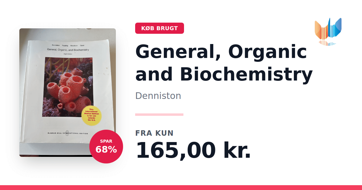 Lige nu kan du købe "General, Organic and Biochemistry" af Denniston til kun 165,00 kr. Du sparer hele 68% af nyprisen! Bogen du ser her er brugt, og i god stand. Vi har i øjeblikket kun et enkelt eksemplar til salg af "General, Organic, and Biochemistry", så slå til mens du kan!