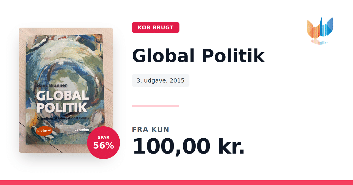 Lige nu kan du købe "Global Politik" til kun 100,00 kr. Du sparer hele 56% af nyprisen! Bogen du ser her er brugt, og i perfekt stand. Vi har i øjeblikket 3 eksemplarer til salg af "Global politik", så husk at se de forskellige udgaver.