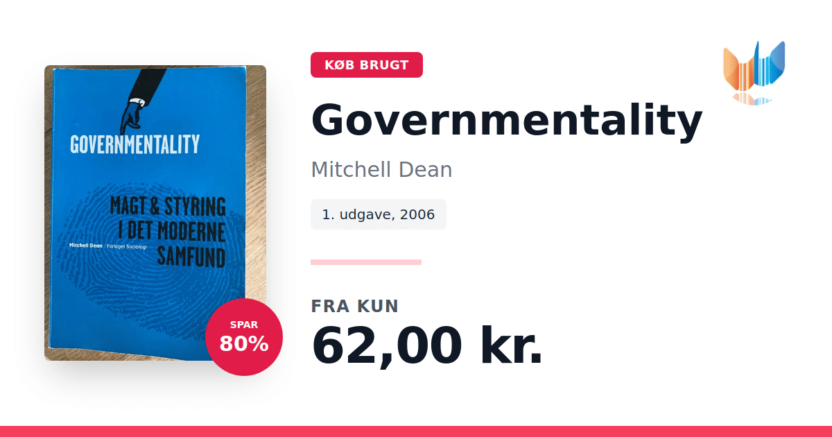 Mitchell Deans "Governmentality" markerer den første danske introduktion til begrebet governmentality og tilbyder en banebrydende tilgang til analysen af magt, styring og politik. Baseret på Michel Foucaults teoretiske bidrag placerer Dean denne metodologi inden for et bredt videnskabeligt perspektiv, der tydeliggør, hvordan governmentality adskiller sig fra andre strømninger som kritisk teori og modernitetsteori. Med en dybdegående teoretisk indsigt argumenterer Dean for, at governmentality skal have en central plads i studiet af samfundsvidenskab. Bogen demonstrerer, hvordan begrebet åbner op for nye perspektiver på magtrelationer og individets forhold til staten, og den bidrager dermed med en nyorienteret forståelse af styring og magtudøvelse i samfundet.