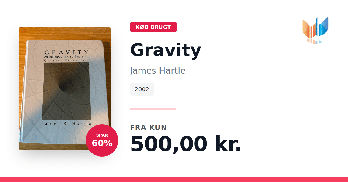 Gravity - An Introduction to Einstein’s General Relativity af James Hartle (2002) er en grundig og tilgængelig introduktion til generalrelativitet, udgivet af Pearson Education i en smuk hardcover-udgave på 608 sider. Med en "fysik først"-metode præsenteres de væsentligste begreber med et minimum af ny matematik, så alle fysikstuderende kan følge med. Gennem en række fængende eksempler demonstreres, hvordan Einsteins teori beskriver både dagligdags og ekstreme fænomener. GPS-systemet, sorte huller, røntgenkilder, pulsarer og kvasarer bruges som konkrete cases, der levendegør rumtidens krumning og dens konsekvenser. Bogen binder teori og observation tæt sammen og fører læseren fra gravitationsbølger til universets begyndelse ved Big Bang og videre til kosmos’ store struktur. Et uundværligt værk for alle, der ønsker en solid, men ikke overvældende, forståelse af gravitationsfysikken.