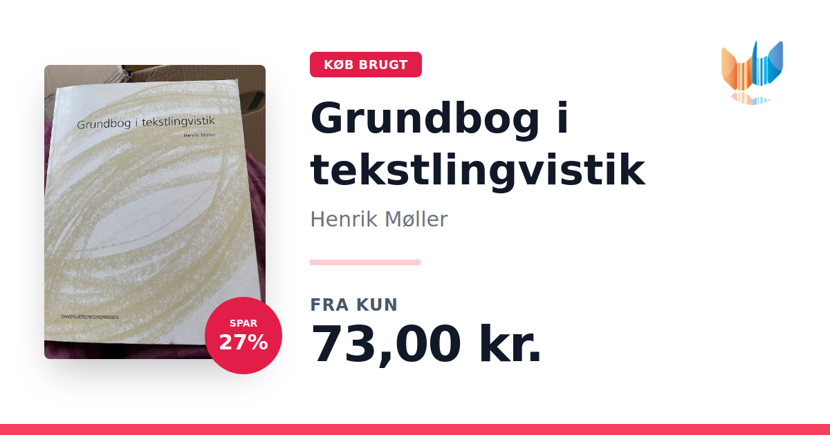 Lige nu kan du købe "Grundbog i tekstlingvistik" af Henrik Møller til kun 73,00 kr. Du sparer hele 27% af nyprisen! Bogen du ser her er brugt, og i god stand. Vi har i øjeblikket kun et enkelt eksemplar til salg af "Grundbog i tekstlingvistik", så slå til mens du kan!
