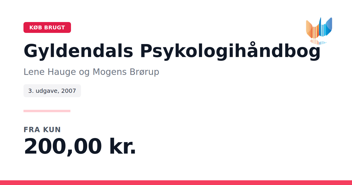 Lige nu kan du købe "Gyldendals Psykologihåndbog" af Lene Hauge og Mogens Brørup til kun 200,00 kr. Bogen du ser her er brugt, og i perfekt stand. Vi har i øjeblikket 2 eksemplarer til salg af "Gyldendals Psykologihåndbog", så husk at se de forskellige udgaver.