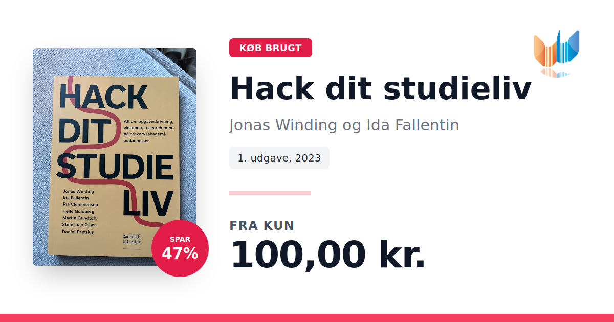 Lige nu kan du købe "Hack dit studieliv" af Jonas Winding og Ida Fallentin til kun 100,00 kr. Du sparer hele 47% af nyprisen! Bogen du ser her er brugt, og i perfekt stand. Vi har i øjeblikket kun et enkelt eksemplar til salg af "Hack dit studieliv", så slå til mens du kan!