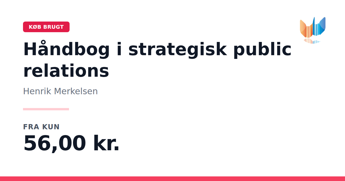 Lige nu kan du købe "Håndbog i strategisk public relations" af Henrik Merkelsen til kun 56,00 kr. Du sparer hele 86% af nyprisen! Bogen du ser her er brugt, og i perfekt stand. Vi har i øjeblikket 2 eksemplarer til salg af "Håndbog i strategisk public relations", så husk at se de forskellige udgaver.