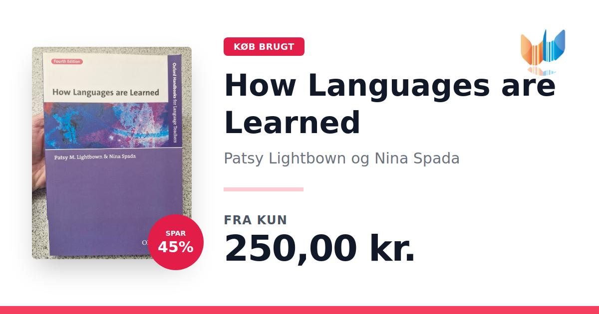 How Languages Are Learned 4. udgave af Patsy Lightbown og Nina Spada er en grundigt opdateret og let tilgængelig indføring i sprogtilegnelse, udgivet i 2013 af Oxford University Press som paperback. Bogen præsenterer centrale teorier og koncepter, der forklarer, hvordan sprog indlæres, og giver læseren et klart overblik over både historiske og nyere forskningsresultater. Med fokus på at bygge bro mellem teori og praksis trækker forfatterne konsekvente pædagogiske implikationer ud af forskningen og viser, hvordan disse kan anvendes direkte i klasseværelset. Denne 304-siders håndbog er uundværlig både for studerende på læreruddannelser og for nye såvel som erfarne undervisere, der ønsker at styrke deres sprogtilegnelsesundervisning.
