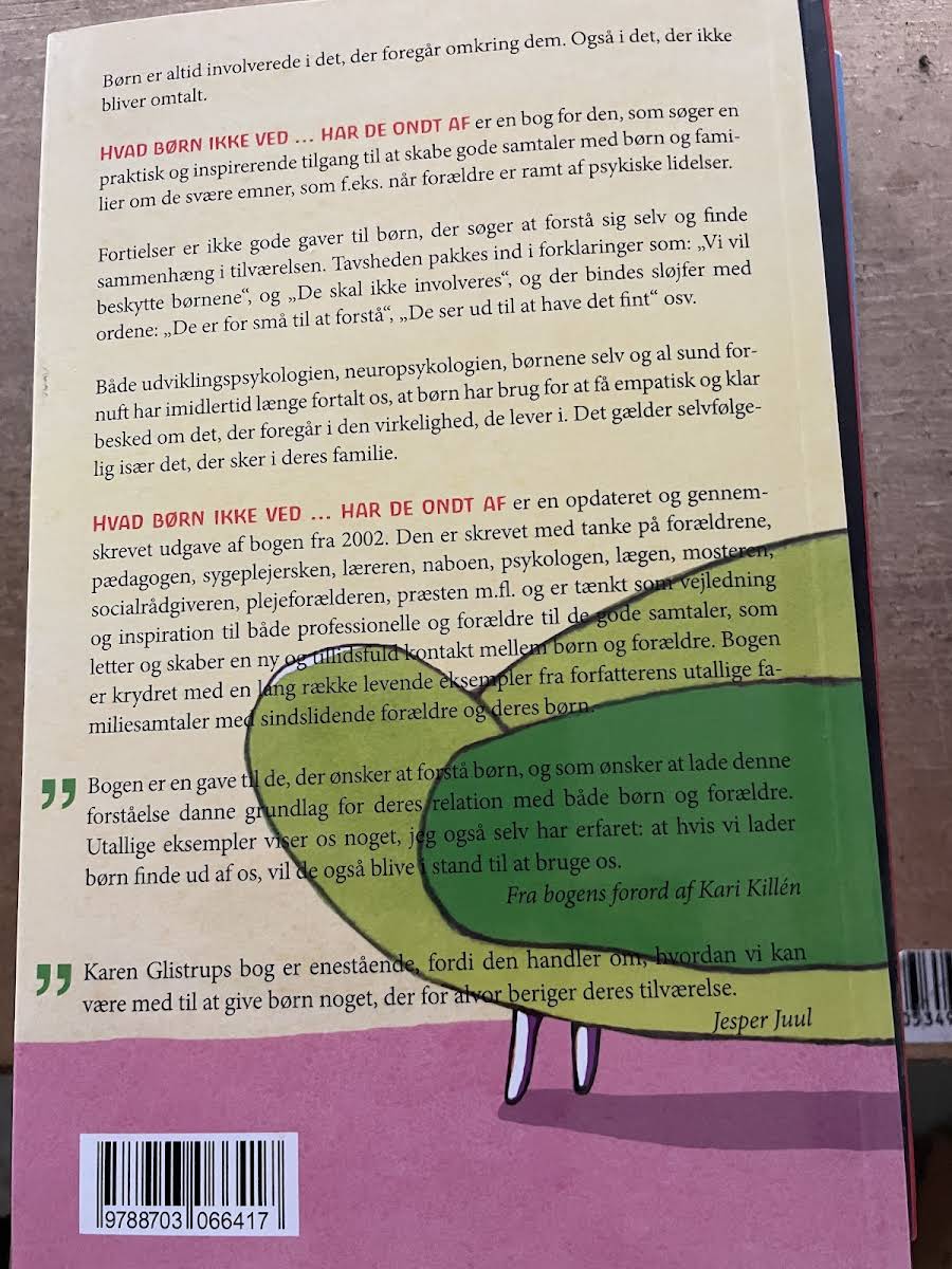 *Hvad børn ikke ved ... har de ondt af* af Karen Glistrup giver dig en konkret og motiverende metode til at bryde tavsheden. Her får du brugbare redskaber til at skabe trygge og meningsfulde samtaler med børn og deres familier, når dialogen falder på de svære emner.