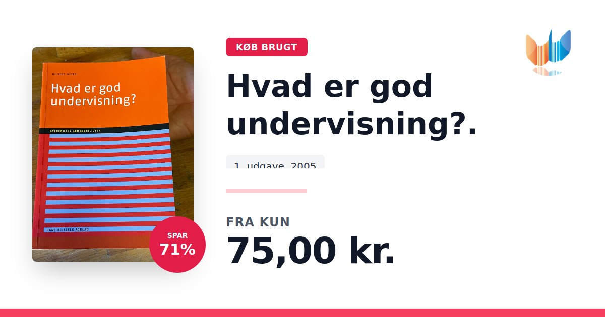 Lige nu kan du købe "Hvad er god undervisning?." til kun 75,00 kr. Du sparer hele 71% af nyprisen! Bogen du ser her er brugt, og i perfekt stand. Vi har i øjeblikket 3 eksemplarer til salg af "Hvad er god undervisning?.", så husk at se de forskellige udgaver.