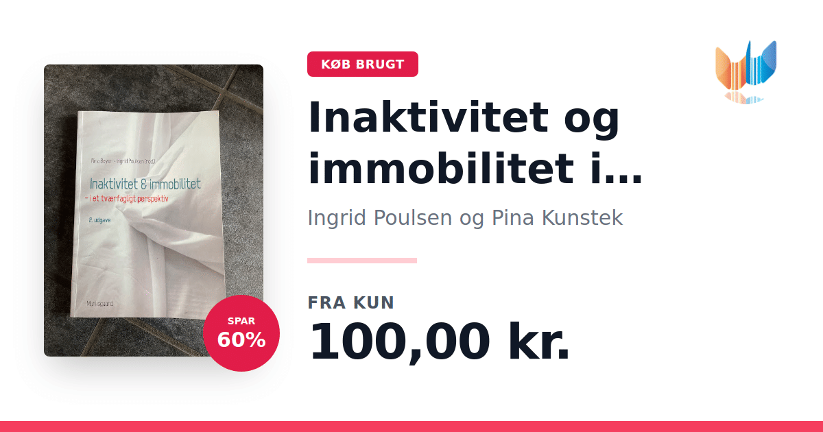 Lige nu kan du købe "Inaktivitet og immobilitet i tværfagligt perspektiv" af Annie Høgh og Bente Klarlund Pedersen til kun 60,00 kr. Du sparer hele 76% af nyprisen! Bogen du ser her er brugt, og i god stand. Vi har i øjeblikket 5 eksemplarer til salg af "Inaktivitet og immobilitet i tværfagligt perspektiv", så husk at se de forskellige udgaver.