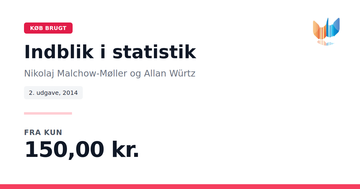 Lige nu kan du købe "Indblik i statistik" af Nikolaj Malchow-Møller og Allan Würtz til kun 150,00 kr. Du sparer hele 68% af nyprisen! Bogen du ser her er brugt, og i perfekt stand. Vi har i øjeblikket 4 eksemplarer til salg af "Indblik i statistik", så husk at se de forskellige udgaver.