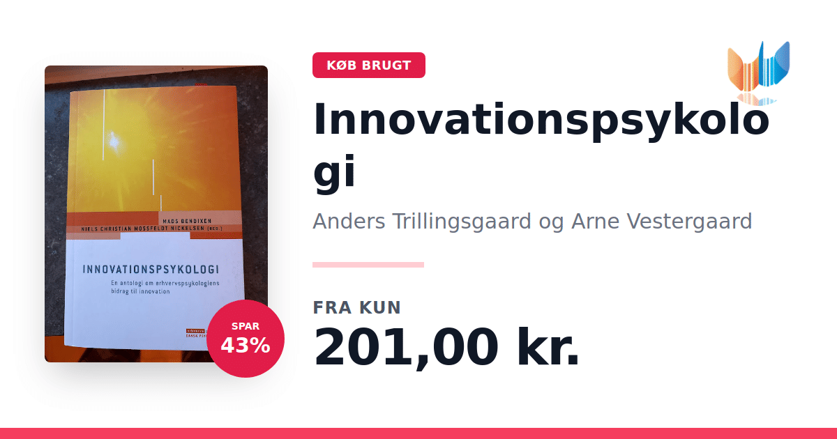 Lige nu kan du købe "Innovationspsykologi" af Anders Trillingsgaard og Arne Vestergaard til kun 201,00 kr. Du sparer hele 43% af nyprisen! Bogen du ser her er brugt, og i perfekt stand. Vi har i øjeblikket kun et enkelt eksemplar til salg af "Innovationspsykologi", så slå til mens du kan!