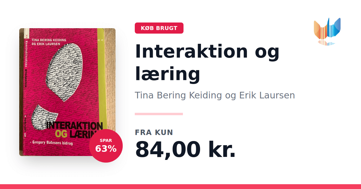 Lige nu kan du købe "Interaktion og læring" af Tina Bering Keiding og Erik Laursen til kun 84,00 kr. Du sparer hele 63% af nyprisen! Bogen du ser her er brugt, og i perfekt stand. Vi har i øjeblikket kun et enkelt eksemplar til salg af "Interaktion og læring", så slå til mens du kan!