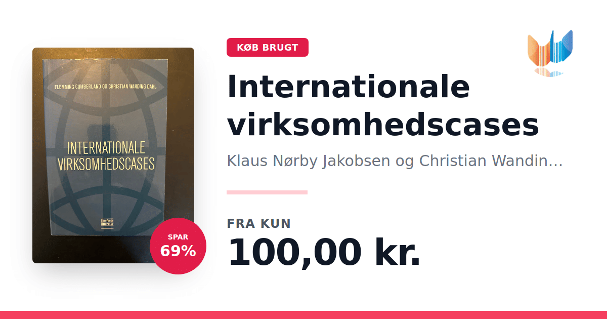 Lige nu kan du købe "Internationale virksomhedscases" af Klaus Nørby Jakobsen og Christian Wanding Dahl til kun 100,00 kr. Du sparer hele 69% af nyprisen! Bogen du ser her er brugt, og i perfekt stand. Vi har i øjeblikket kun et enkelt eksemplar til salg af "Internationale Virksomhedscases", så slå til mens du kan!