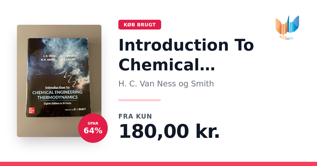 Lige nu kan du købe "Introduction To Chemical Engineering Thermodynamic" af H. C. Van Ness og Smith til kun 180,00 kr. Du sparer hele 64% af nyprisen! Bogen du ser her er brugt, og i god stand. Vi har i øjeblikket kun et enkelt eksemplar til salg af "Introduction To Chemical Engineering Thermodynamic", så slå til mens du kan!