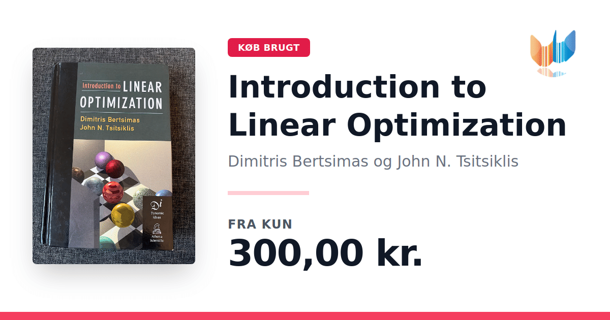 Lige nu kan du købe "Introduction to Linear Optimization" af Dimitris Bertsimas og John N. Tsitsiklis til kun 300,00 kr. Bogen du ser her er brugt, og i perfekt stand. Vi har i øjeblikket kun et enkelt eksemplar til salg af "Introduction to Linear Optimization", så slå til mens du kan!