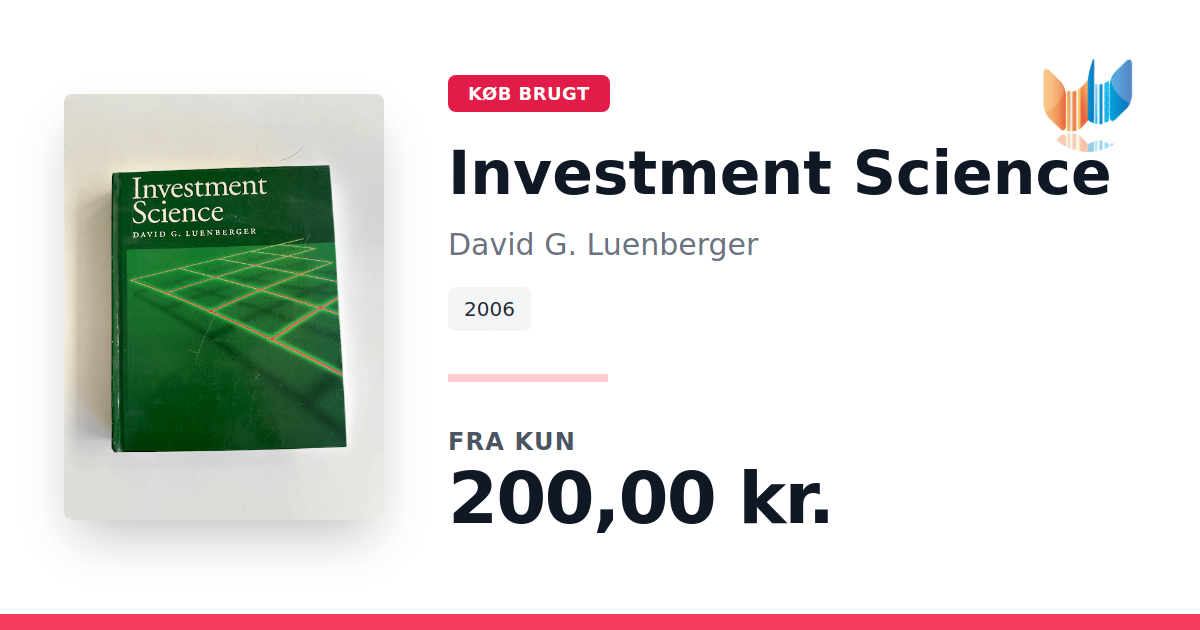 Lige nu kan du købe "Investment Science" af David G. Luenberger til kun 200,00 kr. Bogen du ser her er brugt, og i god stand. Vi har i øjeblikket kun et enkelt eksemplar til salg af "Investment Science", så slå til mens du kan!
