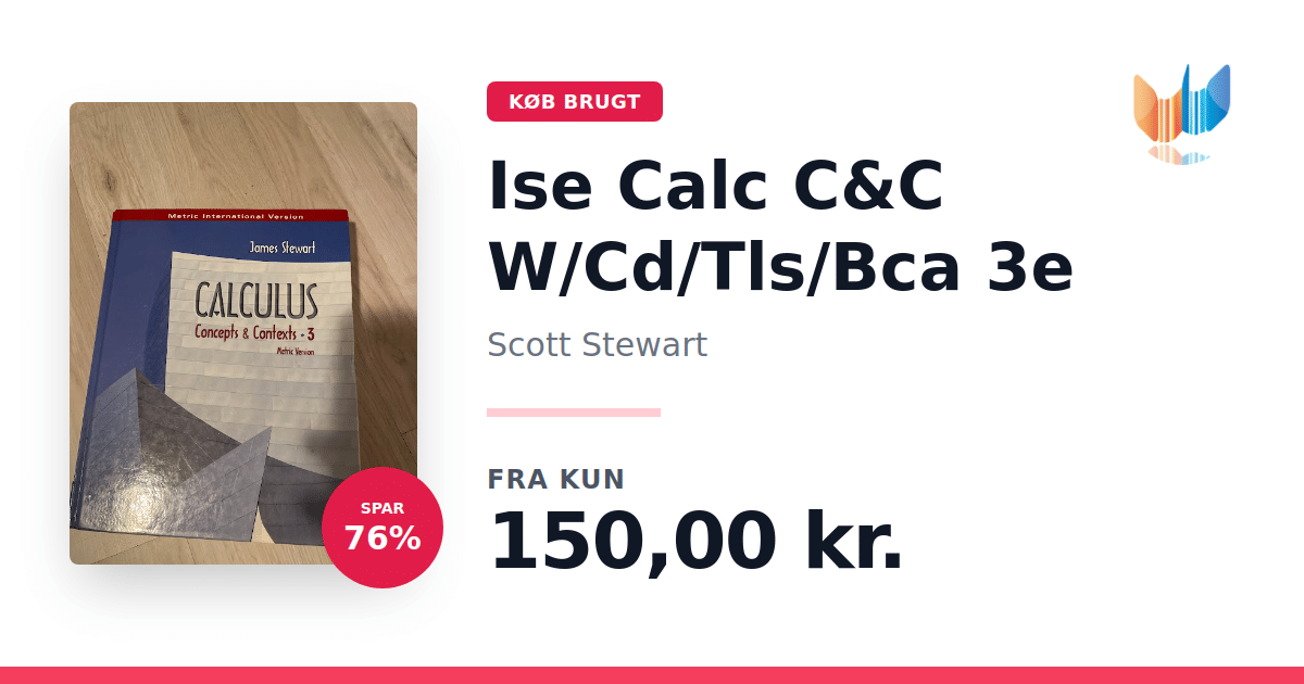 Lige nu kan du købe "Ise Calc C&C W/Cd/Tls/Bca 3e" af Scott Stewart til kun 150,00 kr. Du sparer hele 76% af nyprisen! Bogen du ser her er brugt, og i perfekt stand. Vi har i øjeblikket 4 eksemplarer til salg af "Ise Calc C&C W/Cd/Tls/Bca 3e", så husk at se de forskellige udgaver.