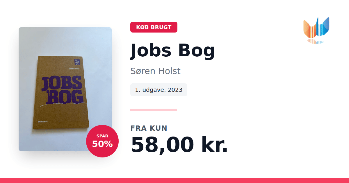 Lige nu kan du købe "Jobs Bog" af Søren Holst til kun 58,00 kr. Du sparer hele 50% af nyprisen! Bogen du ser her er brugt, og i perfekt stand. Vi har i øjeblikket kun et enkelt eksemplar til salg af "Jobs Bog", så slå til mens du kan!