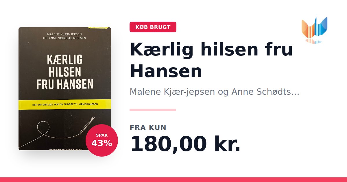Lige nu kan du købe "Kærlig hilsen fru Hansen" af Malene Kjær-jepsen og Anne Schødts nielsen til kun 180,00 kr. Du sparer hele 43% af nyprisen! Bogen du ser her er brugt, og i god stand. Vi har i øjeblikket kun et enkelt eksemplar til salg af "Kærlig hilsen fru Hansen", så slå til mens du kan!