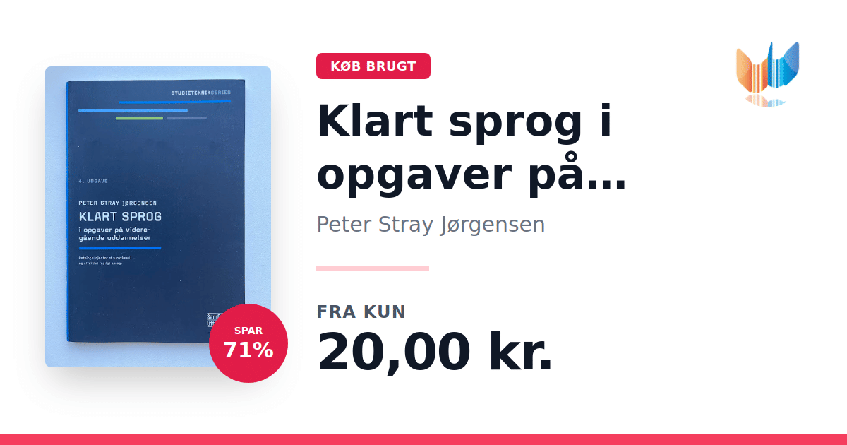 Lige nu kan du købe "Klart sprog i opgaver på videregående uddannelser" af Peter Stray Jørgensen til kun 20,00 kr. Du sparer hele 71% af nyprisen! Bogen du ser her er brugt, og i perfekt stand. Vi har i øjeblikket kun et enkelt eksemplar til salg af "Klart sprog i opgaver på videregående uddannelser", så slå til mens du kan!