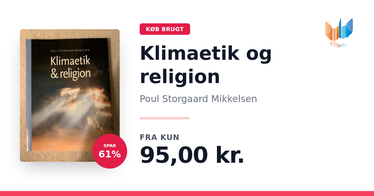 "Klimaetik og religion" af Poul Storgaard Mikkelsen, udgivet af Forlaget Univers i 2020, præsenterer en frisk tilgang til de etiske, politiske og religiøse aspekter af klimakrisen. Bogen udfolder, hvordan historiske, filosofiske og etiske traditioner kan understøtte en dybere forståelse af de komplekse dilemmaer, som moderne samfund står overfor i en tid med øget fokus på klima- og miljøudfordringer. Med en analytisk tilgang stiller bogen skarpe spørgsmål om sammenhængen mellem bekæmpelse af fattigdom og genoprettelse af naturens balance. Den undersøger også forholdet mellem sekulær og religiøs etik samt de etiske valg, der gør sig gældende på både nationalt og globalt plan. Desuden integreres et generationsperspektiv, som bidrager til en nuanceret debat om, hvordan klimaudfordringerne påvirker både individet og samfundet. Velegnet som undervisningsmateriale til gymnasium og HF, inviterer "Klimaetik og religion" til refleksion og faglig fordybelse. Dens velovervejede indhold og relevante problemstillinger gør den til et interessant redskab for alle, der ønsker at forstå de etiske dimensioner i den aktuelle klimadebat.