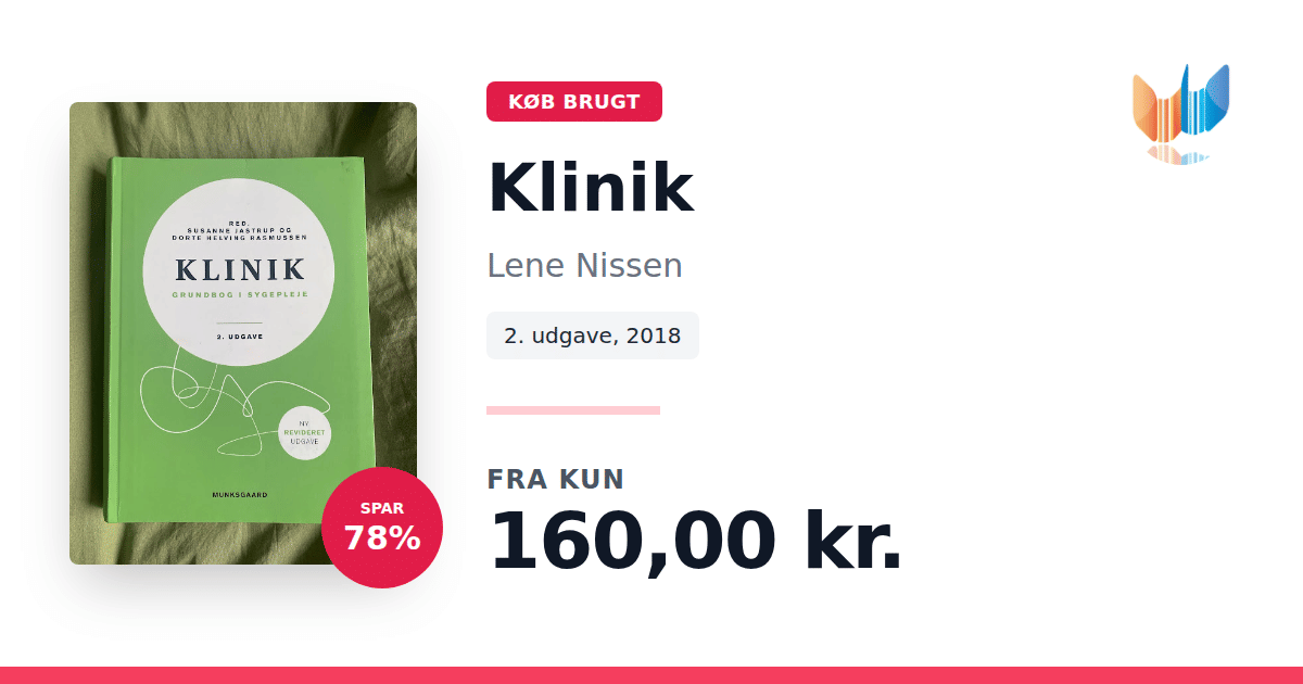 Lige nu kan du købe "Klinik" af Lene Nissen til kun 160,00 kr. Du sparer hele 78% af nyprisen! Bogen du ser her er brugt, og i perfekt stand. Vi har i øjeblikket 8 eksemplarer til salg af "Klinik", så husk at se de forskellige udgaver.