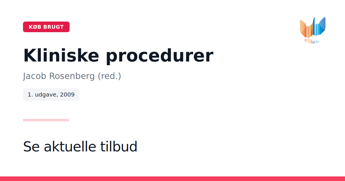 Kliniske procedurer er en praktisk håndbog, der samler centrale kliniske procedurer, som er uundværlige i det daglige arbejde på klinikken. Bogen giver både medicinstuderende og færdiguddannede adgang til en række vigtige procedurer, der er beskrevet af eksperter og grundigt efterprøvet i klinisk praksis. Bogen, redigeret af Jacob Rosenberg, præsenterer en struktureret tilgang til emnerne ved at opdele indholdet efter medicinske områder, hvilket øger forståelsen og overblikket. Fremstillet på baggrund af artikler, der tidligere er publiceret i Ugeskrift for Læger, sikrer denne samling en opdateret og fagligt forankret vejledning, som løbende kan suppleres med nye indsigter og reviderede fakta.