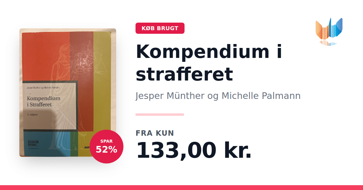 Lige nu kan du købe "Kompendium i strafferet" af Jesper Münther og Michelle Palmann til kun 133,00 kr. Du sparer hele 52% af nyprisen! Bogen du ser her er brugt, og i god stand. Vi har i øjeblikket 2 eksemplarer til salg af "Kompendium i Strafferet", så husk at se de forskellige udgaver.