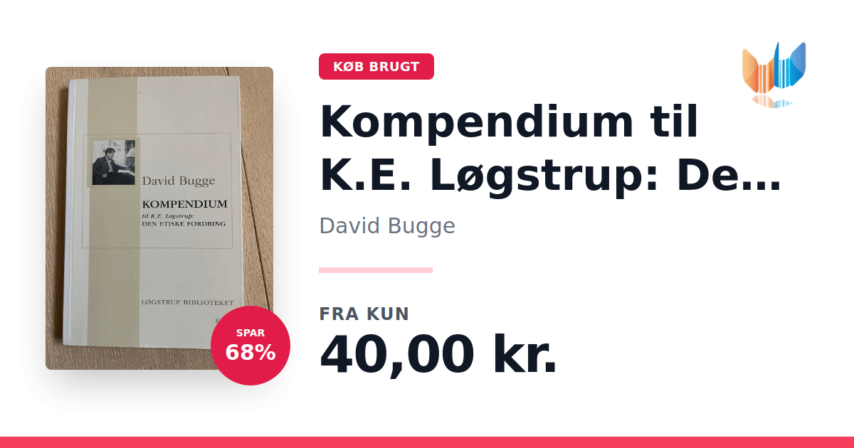 Lige nu kan du købe "Kompendium til K.E. Løgstrup: Den etiske fordring" af David Bugge til kun 40,00 kr. Du sparer hele 68% af nyprisen! Bogen du ser her er brugt, og i perfekt stand. Vi har i øjeblikket kun et enkelt eksemplar til salg af "Kompendium til K.E. Løgstrup: Den etiske fordring", så slå til mens du kan!