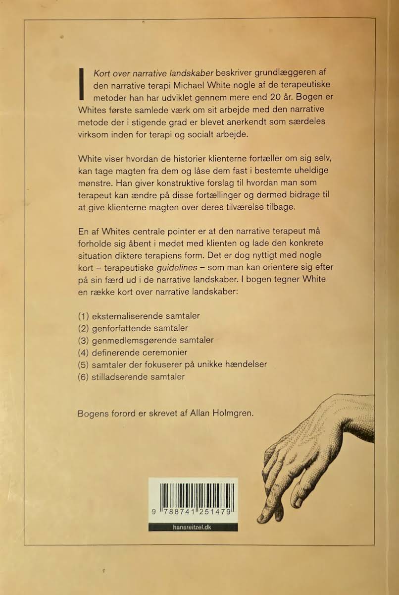 Kort over narrative landskaber er et centralt værk af Michael White, manden bag den narrative terapimetode. I bogen præsenteres et udvalg af terapeutiske teknikker, som understreger vigtigheden af at møde klienten med åbenhed og lade den konkrete situation bestemme terapiformen. Med udgangspunkt i mange års erfaring demonstrerer White, hvordan den måde, vi fortæller vores egne historier på, kan fastlåse os i mønstre, der hæmmer forandring. Gennem en række illustrative eksempler opfordrer han terapeuten til at arbejde kreativt med samtalen – fra eksternaliserende dialoger til genforfattende samtaler – med henblik på at åbne op for nye fortællinger og muligheder. Bogen udgør således en inspirerende og dybtgående guide til narrativ terapi, der både er praktisk funderet og etisk forankret. Kort over narrative landskaber byder på et unikt overblik over de metoder, der har hjulpet utallige mennesker til at ændre deres livshistorie.