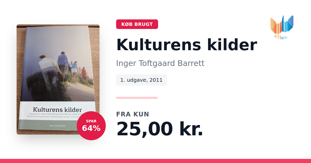 Lige nu kan du købe "Kulturens kilder" af Inger Toftgaard Barrett til kun 25,00 kr. Du sparer hele 64% af nyprisen! Bogen du ser her er brugt, og i god stand. Vi har i øjeblikket 2 eksemplarer til salg af "Kulturens kilder", så husk at se de forskellige udgaver.