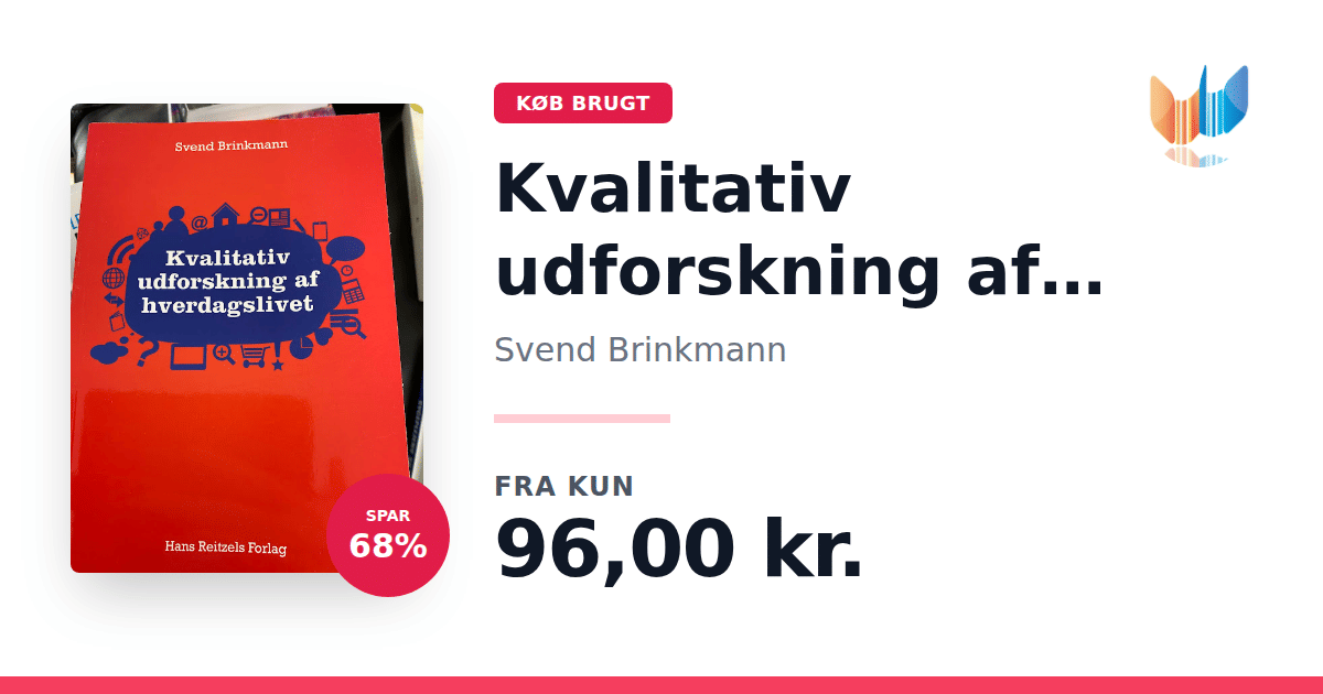 Lige nu kan du købe "Kvalitativ udforskning af hverdagslivet" af Svend Brinkmann til kun 96,00 kr. Du sparer hele 68% af nyprisen! Bogen du ser her er brugt, og i god stand. Vi har i øjeblikket kun et enkelt eksemplar til salg af "Kvalitativ udforskning af hverdagslivet", så slå til mens du kan!