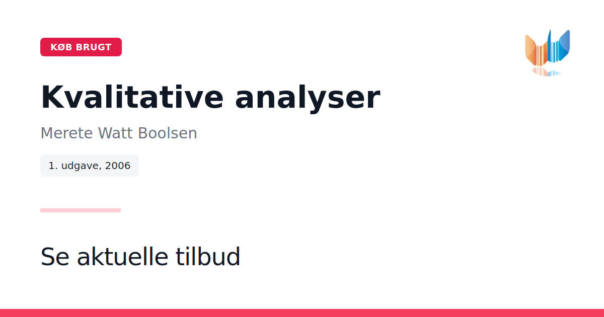 Kvalitative analyser er en grundig introduktion til, hvordan man systematisk kan afdække samspillet mellem individet og det omgivende samfund. Bogen illustrerer, hvorfor det er essentielt for en lang række faggrupper – fra pædagoger og socialarbejdere til sygeplejersker og politi – at forstå de bagvedliggende mekanismer, der former menneskelig adfærd og sociale strukturer. Gennem en klar og struktureret fremstilling fører Merete Watt Boolsen læseren igennem de fire centrale faser i forskningsprocessen. Fra formuleringen af forskningsproblemer og planlægning af undersøgelser til indsamlingen, konstruktionen og den efterfølgende analyse af data, giver bogen en fast metodologisk ryggrad, der understøtter fundne konklusioner og strategiske overvejelser. Bogen præsenterer desuden forskellige analysetilgangsvinkler, herunder indholdsanalyse, grounded theory, argumentationsanalyse og diskursanalyse. Eksemplerne og den praktiske tilgang gør den særligt velegnet for både studerende og praktikere inden for bl.a. pædagogik, socialt arbejde, politi og sundhedspleje, hvor forståelsen af menneskesamfundet er i fokus. Med sin solide faglige baggrund og mange års erfaring i undervisning og forskning formidler Merete Watt Boolsen en metodisk guide, der fungerer som et uundværligt redskab for dem, der ønsker at arbejde kvalitative analyser ind i deres faglige praksis.