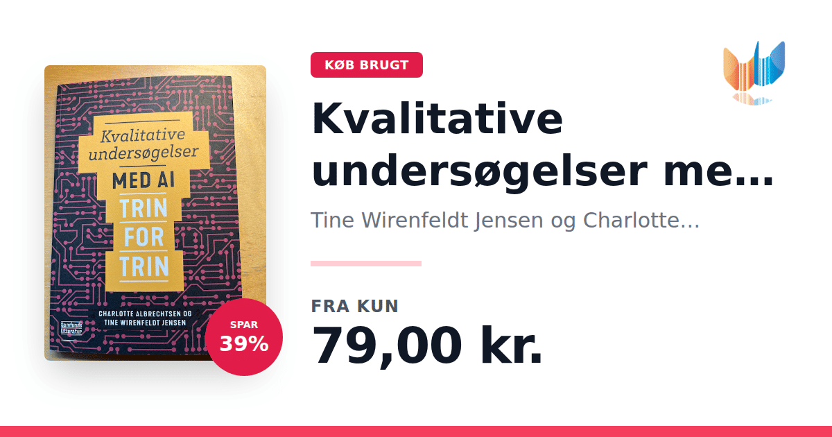 Lige nu kan du købe "Kvalitative undersøgelser med AI" af Tine Wirenfeldt Jensen og Charlotte Albrechtsen til kun 79,00 kr. Du sparer hele 39% af nyprisen! Bogen du ser her er brugt, og i perfekt stand. Vi har i øjeblikket kun et enkelt eksemplar til salg af "Kvalitative undersøgelser med AI", så slå til mens du kan!
