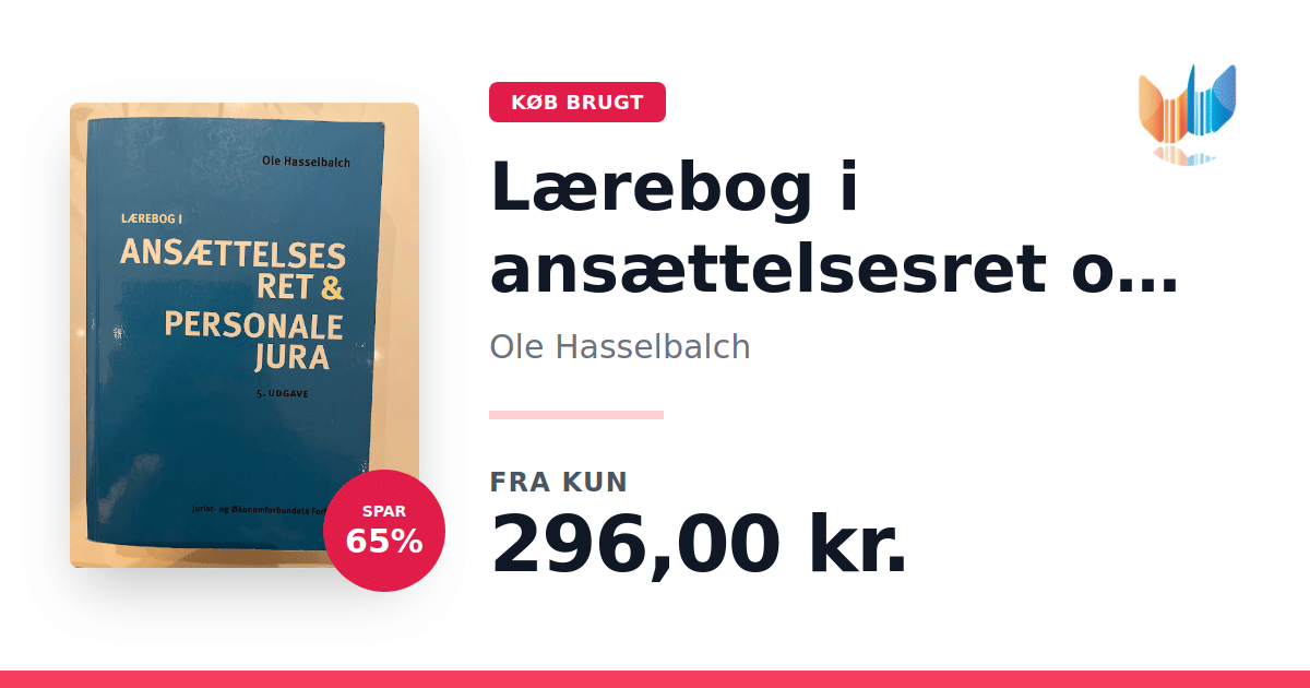 Lige nu kan du købe "Lærebog i ansættelsesret og personalejura" af Ole Hasselbalch til kun 296,00 kr. Du sparer hele 65% af nyprisen! Bogen du ser her er brugt, og i god stand. Vi har i øjeblikket kun et enkelt eksemplar til salg af "Lærebog i ansættelsesret og personalejura", så slå til mens du kan!