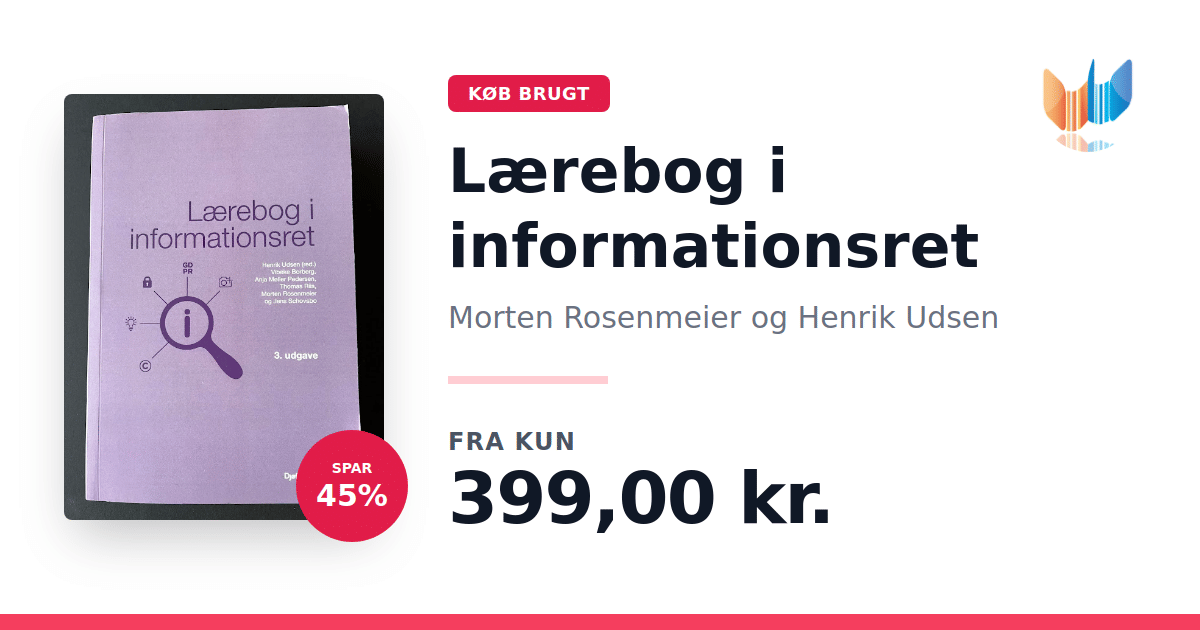 Lige nu kan du købe "Lærebog i informationsret" af Morten Rosenmeier og Henrik Udsen til kun 399,00 kr. Du sparer hele 45% af nyprisen! Bogen du ser her er brugt, og i perfekt stand. Vi har i øjeblikket 2 eksemplarer til salg af "Lærebog i informationsret", så husk at se de forskellige udgaver.