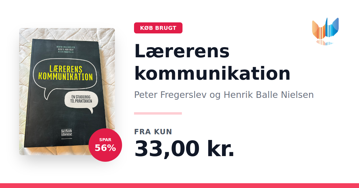 Lige nu kan du købe "Lærerens kommunikation" af Peter Fregerslev og Henrik Balle Nielsen til kun 33,00 kr. Du sparer hele 56% af nyprisen! Bogen du ser her er brugt, og i perfekt stand. Vi har i øjeblikket kun et enkelt eksemplar til salg af "Lærerens kommunikation", så slå til mens du kan!